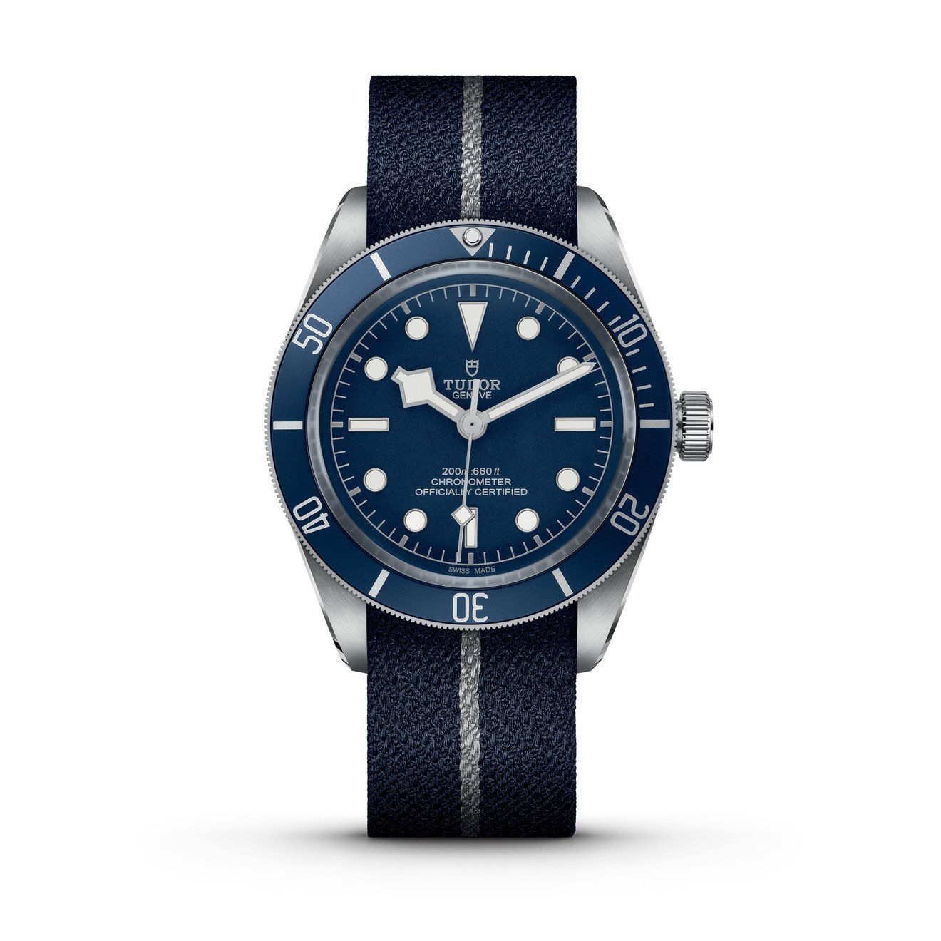 39-mm steel case, blue fabric strap. 39-mm steel case with polished and satin finish. Unidirectional rotatable bezel in steel with 60-minute graduated disk in matte blue anodized aluminum and silver gilded markings and numerals. Manufacture Caliber MT5402 (COSC) Self-winding mechanical movement with bidirectional rotor system. Blue, domed. Steel screw-down winding crown, with the TUDOR rose, with circular satin-brushed steel winding crown tube. Domed sapphire crystal. Waterproof to 200 m (660 ft). Blue fabric strap with buckle.
