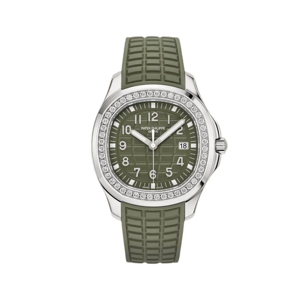 Patek Philippe reinterprets the quartz Aquanaut Luce with a larger diameter and a new integrated composite strap. This watch features a 38.8mm stainless steel case, screw-down crown and solid case back. The bezel is lit up by a row of 48 diamonds (~1.11 ct) surrounding the khaki green dial embossed with the Aquanaut pattern. The khaki green rubber strap closes with an Aquanaut fold-over clasp.