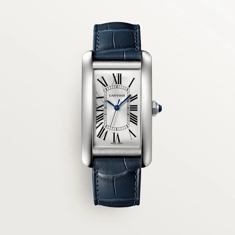 Tank Américaine watch, large model, mechanical movement with automatic winding. Steel case, octagonal crown set with a blue synthetic spinel, silvered dial, blued-steel sword-shaped hands, navy blue semi-matte alligator leather strap, interchangeable deployant buckle. Case dimensions: 45.10 mm x 26.60 mm, thickness: 9.81 mm. Water-resistant up to 3 bar (approx. 30 meters/100 feet).