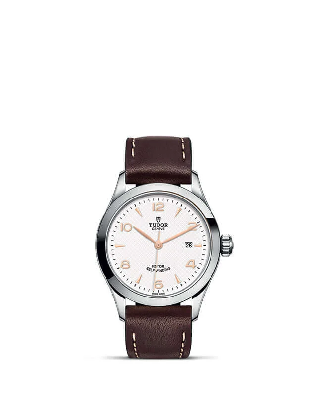 Five year guarantee. 28 mm steel case with polished finish. Manufacture Calibre MT5621 (COSC). Self-winding mechanical movement, Calibre 2824. Power reserve of approximately 38 hours. Steel winding crown with TUDOR logo in relief. Waterproof to 100 m (330 ft). Smooth bezel with polished finish. White dial, embossed decoration, domed, gold hour markers and hands. Date at 3 o’clock. Sapphire crystal. Brown leather strap with folding clasp and safety catch.